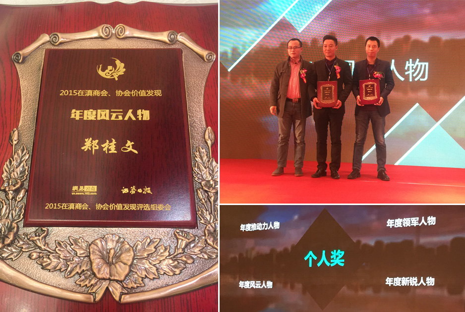 在“2015年在滇商會(huì)協(xié)會(huì)價(jià)值發(fā)現(xiàn)”活動(dòng)中,經(jīng)過(guò)在滇40余家商會(huì)、協(xié)會(huì)及專(zhuān)家組的評(píng)選,云南天度集團(tuán)董事長(zhǎng)鄭桂文榮獲“年度風(fēng)云人物”稱號(hào)。