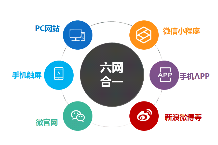 入口為六網(wǎng)合一(PC版、觸屏版WAP、微信版、微博信息推送、手機APP、一個主后臺),