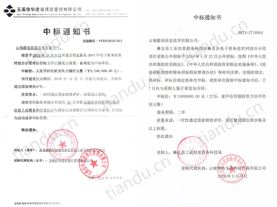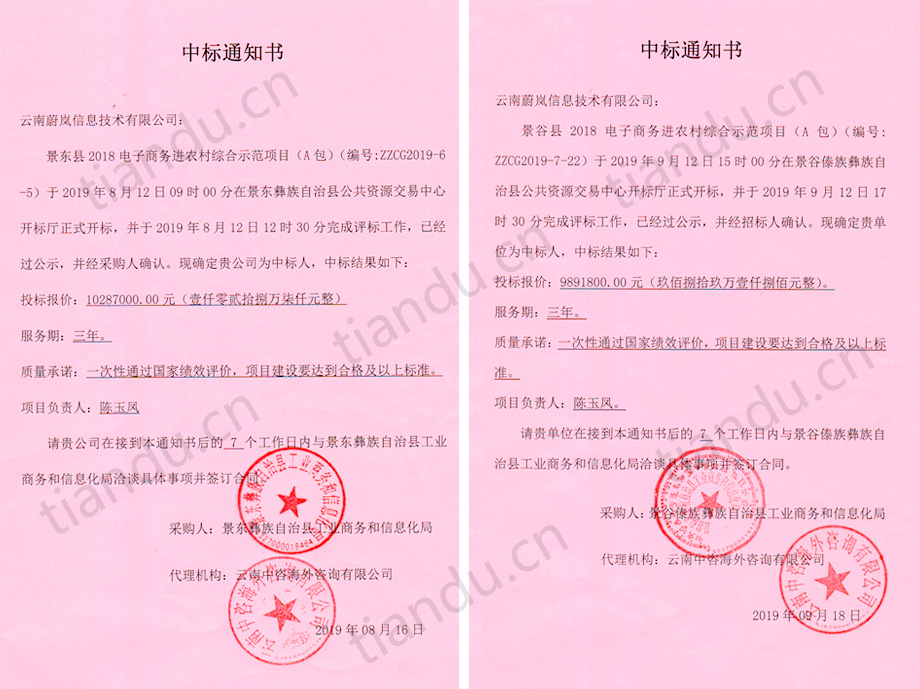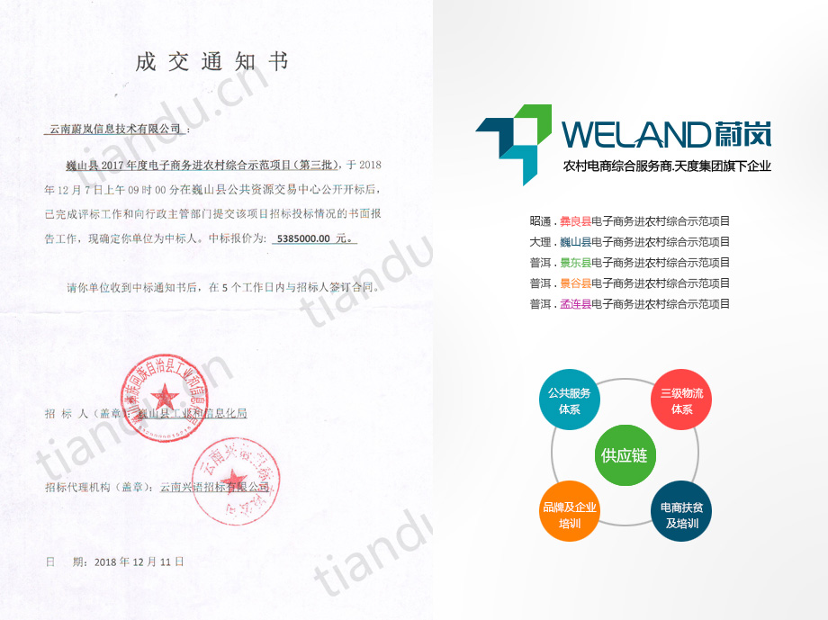 祝賀天度集團旗下“云南蔚嵐信息技術(shù)有限公司”中標景東縣、景谷縣、孟連縣等三個縣的電子商務(wù)進農(nóng)村綜合示范項目,目前云南蔚嵐信息技術(shù)有限公司已經(jīng)為昭通市彝良縣、大理州巍山縣、普洱市景東縣、普洱市景谷縣、普洱市孟連縣等5個縣提供了國家電子商務(wù)進農(nóng)村綜合示范縣項目的服務(wù)。