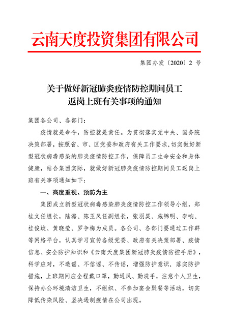 集團(tuán)新型冠狀病毒感染的肺炎疫情防控工作小組制定了《云南天度集團(tuán)新冠肺炎疫情防控操作手冊》并予以印發(fā),請各公司、各部門認(rèn)真貫徹執(zhí)行、嚴(yán)防死守、落實到位、不留死角,確保不出一例疫情。