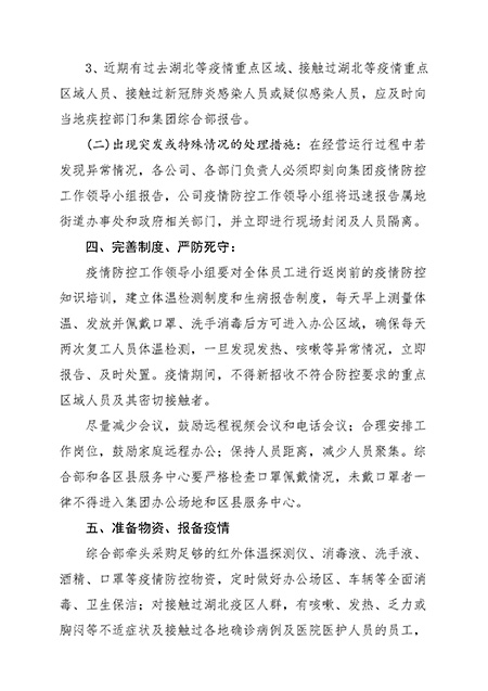 (二)出現(xiàn)突發(fā)或特殊情況的處理措施:在經(jīng)營運行過程中若發(fā)現(xiàn)異常情況,各公司、各部門負(fù)責(zé)人必須即刻向集團(tuán)疫情防控工作領(lǐng)導(dǎo)小組報告,公司疫情防控工作領(lǐng)導(dǎo)小組將迅速報告屬地街道辦事處和政府相關(guān)部門,并立即進(jìn)行現(xiàn)場封閉及人員隔離。