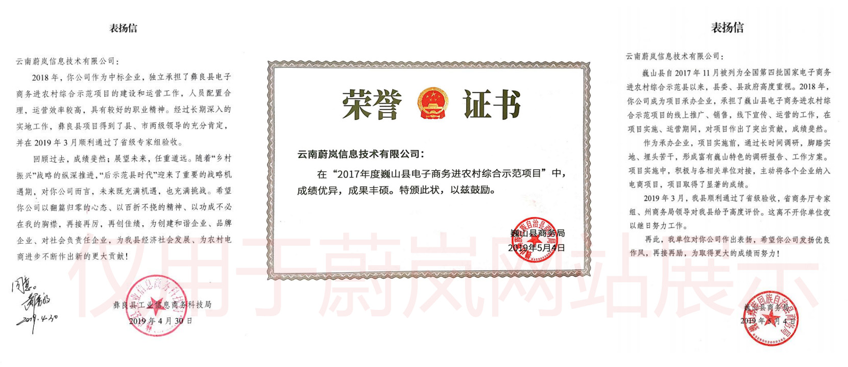 蔚嵐公司已中標(biāo)并承擔(dān)了西雙版納州級統(tǒng)籌、彝良縣、巍山縣、景東縣、景谷縣、孟連縣、勐臘縣、魯?shù)榭h、水富市、河口縣、峨山縣、盤州市等12個(gè)電子商務(wù)進(jìn)農(nóng)村項(xiàng)目建設(shè)和運(yùn)營工作,中標(biāo)臨滄市、文山市、水富市、蒙自市、個(gè)舊市、宣威市、 六盤水市 、麒麟?yún)^(qū)、馬龍區(qū)、陸良縣、永勝縣、 彝良縣、石屏縣、廣南縣、丘北縣等縣域商業(yè)建設(shè)行動服務(wù)商,參與和承擔(dān)玉溪市、隆陽區(qū)的中國好糧油行動示范縣、示范企業(yè)項(xiàng)目建設(shè)。