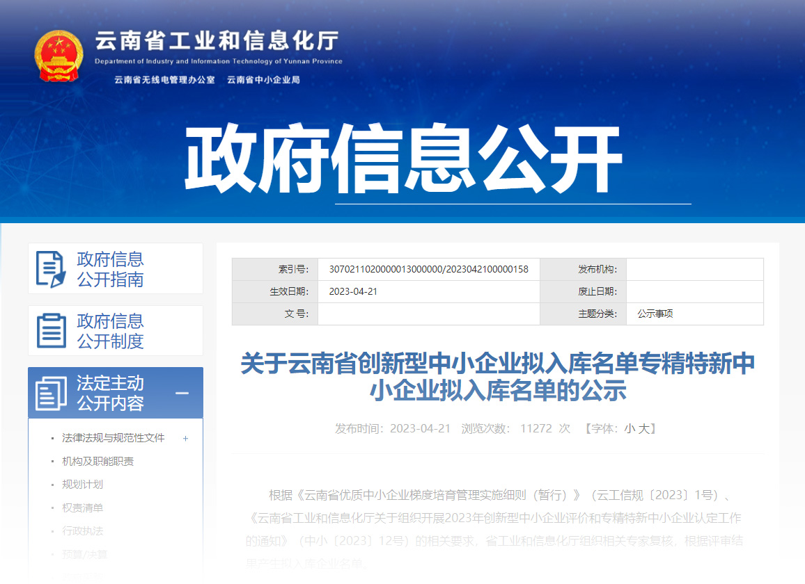 根據(jù)《云南省優(yōu)質(zhì)中小企業(yè)梯度培育管理實(shí)施細(xì)則(暫行)》(云工信規(guī)〔2023〕1號(hào))、《云南省工業(yè)和信息化廳關(guān)于組織開(kāi)展2023年創(chuàng)新型中小企業(yè)評(píng)價(jià)和專(zhuān)精特新中小企業(yè)認(rèn)定工作的通知》(中小〔2023〕12號(hào))的相關(guān)要求,經(jīng)省工業(yè)和信息化廳組織相關(guān)專(zhuān)家復(fù)核,天度集團(tuán)旗下云南天度軟件系統(tǒng)有限公司入選2023年云南省專(zhuān)精特新中小企業(yè)、云南省創(chuàng)新型中小企業(yè)名單;云南蔚嵐信息技術(shù)有限公司入選2023年云南省創(chuàng)新型中小企業(yè)名單。